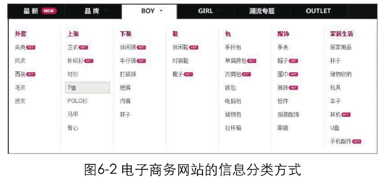 比如,在生活中,要買一件男士T恤,會首先找到商場賣男裝的樓層,再找到店鋪中擺放上衣的區(qū)域去挑選 恤。在電子商務網(wǎng)站對商品進行組織時,同樣采用了這種 “男裝>上裝>T恤" 的分類方式,如圖6-2所示。如果分類方式改成 "上裝>男裝>T恤",你會不會覺得怪怪的呢? 不符合邏輯習慣的分類很容易把用戶弄糊涂 。
