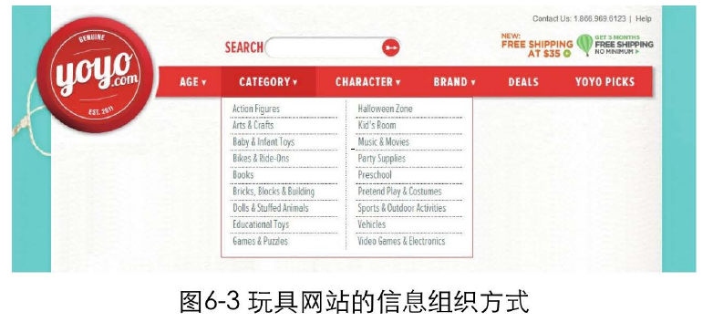 比如,一個玩具網(wǎng)站可以從適用年齡、玩具類別、特點、品牌幾個方面,對玩具進行組織分類,如圖6-3所示。