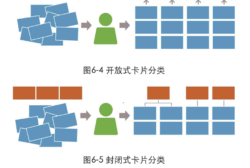 封閉式: 網(wǎng)站制作設計師首先會將導航的架構設計好,確定出導航的個數(shù)和名稱,再將屬于這些類目的卡片分發(fā)給用戶,讓用戶根據(jù)自己的期望,把卡片歸類在不同的導航分類下。如果有些卡片用戶不知道該將它分到哪個類目下,可以將它拿出來,所有卡片不一定要全部分完。封閉式的分類更利于掌控,可以用于對信息設計的結果進行驗證的階段,如圖6-5.圖6-6所示。