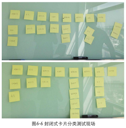 開放式: 開放式的卡片分類會給用戶足夠的自由度來進行信息歸類。設計師將完全打亂的卡片分發(fā)給用戶,用戶可以完全自由地決定把卡片分為幾組、每組有多少張卡片。最后再由用戶為分好組的卡片命名。開放的方式給了用戶極大的發(fā)揮空間。設計師可能會得到更加豐富的分類結果,如圖6-4所示。但對于內(nèi)容復雜、信息量龐大的網(wǎng)站,開放式的分類方法可能會使結果變得不可控。