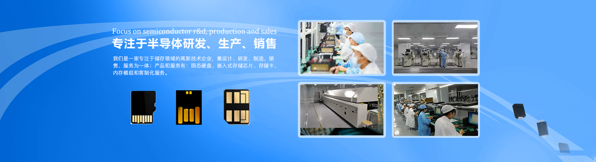我們是一家專(zhuān)注于儲(chǔ)存領(lǐng)域的高新技術(shù)企業(yè),集設(shè)計(jì)、研發(fā)、制造、銷(xiāo)售、服務(wù)為一體;產(chǎn)品和服務(wù)有:固態(tài)硬盤(pán)、嵌入式存儲(chǔ)芯片、存儲(chǔ)卡、內(nèi)存模組和客制化服務(wù)。生產(chǎn)基地總投資 2 億元,生產(chǎn)工廠占地 28900 平米,擁有全球領(lǐng)先的 SiP 封裝工藝生產(chǎn)設(shè)備及測(cè)試設(shè)備 , 年產(chǎn)能 100KK。